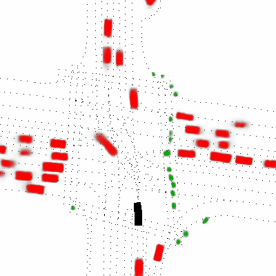 Figure 2. Future occupancy grids for currently-observed agents (left) and currently-occluded agents (right). Red and green pixels show ground-truth future occupancies for vehicles and pedestrians. The black box shows ground-truth future occupancy of the ego vehicle.